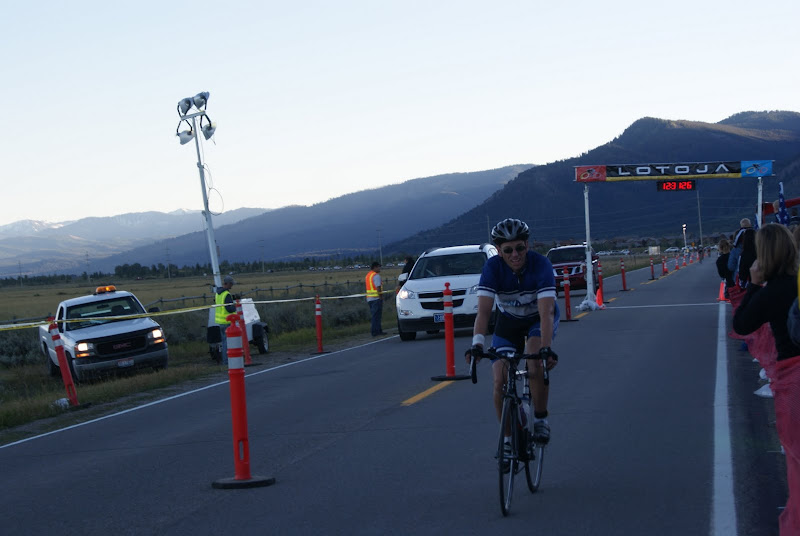 At the 2km sign I see a flashing amber light so far to the north it must be in Montana, no way it can be the finish line, it's probably a traffic detour to keep cars away from the finish line, which has to be much, much closer than that. I pass the 1km sign and realize the flashing light in Montana is the finish line. I start seeing family and spectators on he roadside. No cheers from them though. If they've been here all day they've already watched this happen 799 times and they are now conserving their energy too. I pass the 200 meter point and hear the voice on the PA call out Steven Larsen! like he's announcing my return to the world of the living. I hear a smattering of cheers in the distance, I scan the crowd for a familiar face and spy Jennifer pointing her camera at me. I had practiced 'no-hands' riding in preparation for this moment. I had grand plans of raising both arms in the air victoriously and bellowing something triumphant, a war cry perhaps. What I manage is a one armed, wobbly salute and the first smile I've been able to muster since I last saw Jennifer at the mouth of Snake River Canyon, last week.